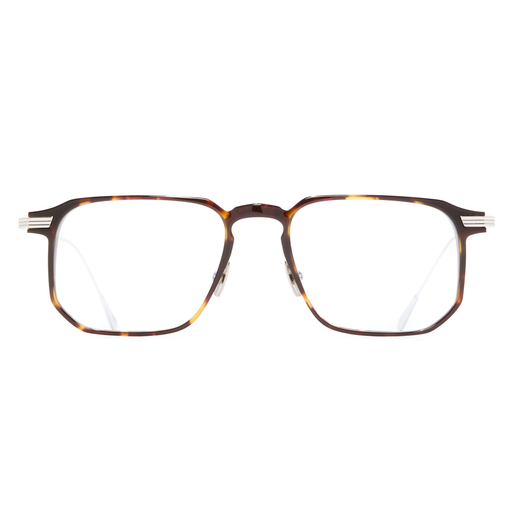 Cutler and Gross's signature Oyster pin has been translated into grooved lugs on this square frame. It is handcrafted with a slim acetate frontal and balanced with ultra-light precious metal temples