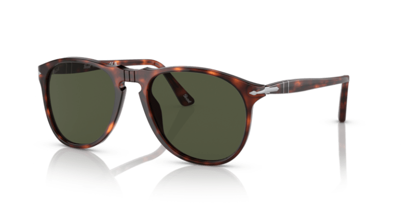 Frame details include a 55 mm lens width, 18 mm bridge, and 145 mm temple length, with a 49 mm lens height. Available in a selection of colours from Havana and Honey to Black, Terra di Siena, and more, including Havana (24/58) – Green Polarized for enhanced contrast in bright light. The option of prescription-ready customization lets you tailor Persol PO9649S to your lenses while maintaining the iconic silhouette.